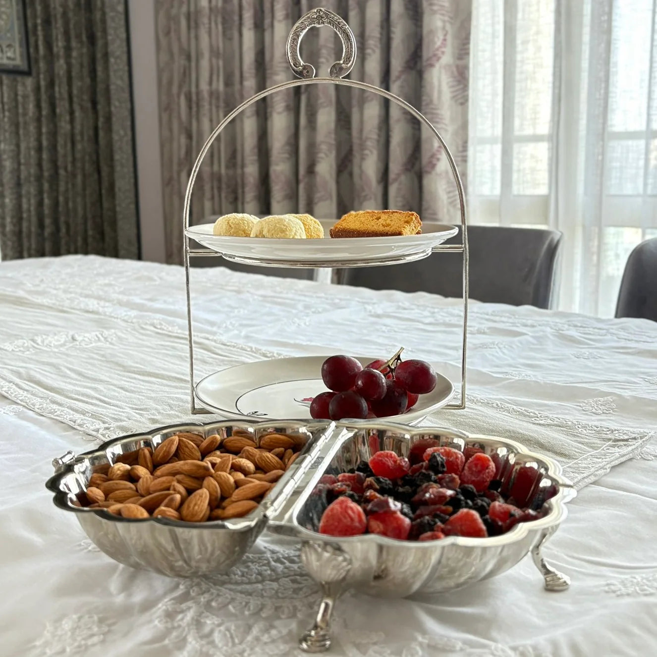 Elevated on a hand-etched brass frame, where artisanal detailing meets heirloom craftsmanship, Gulzaar transcends its purpose. It is more than a serving piece — it is a collector’s treasure, turning petit fours, tea cakes, and delicate indulgences into a tableau of artistry and grandeur.
