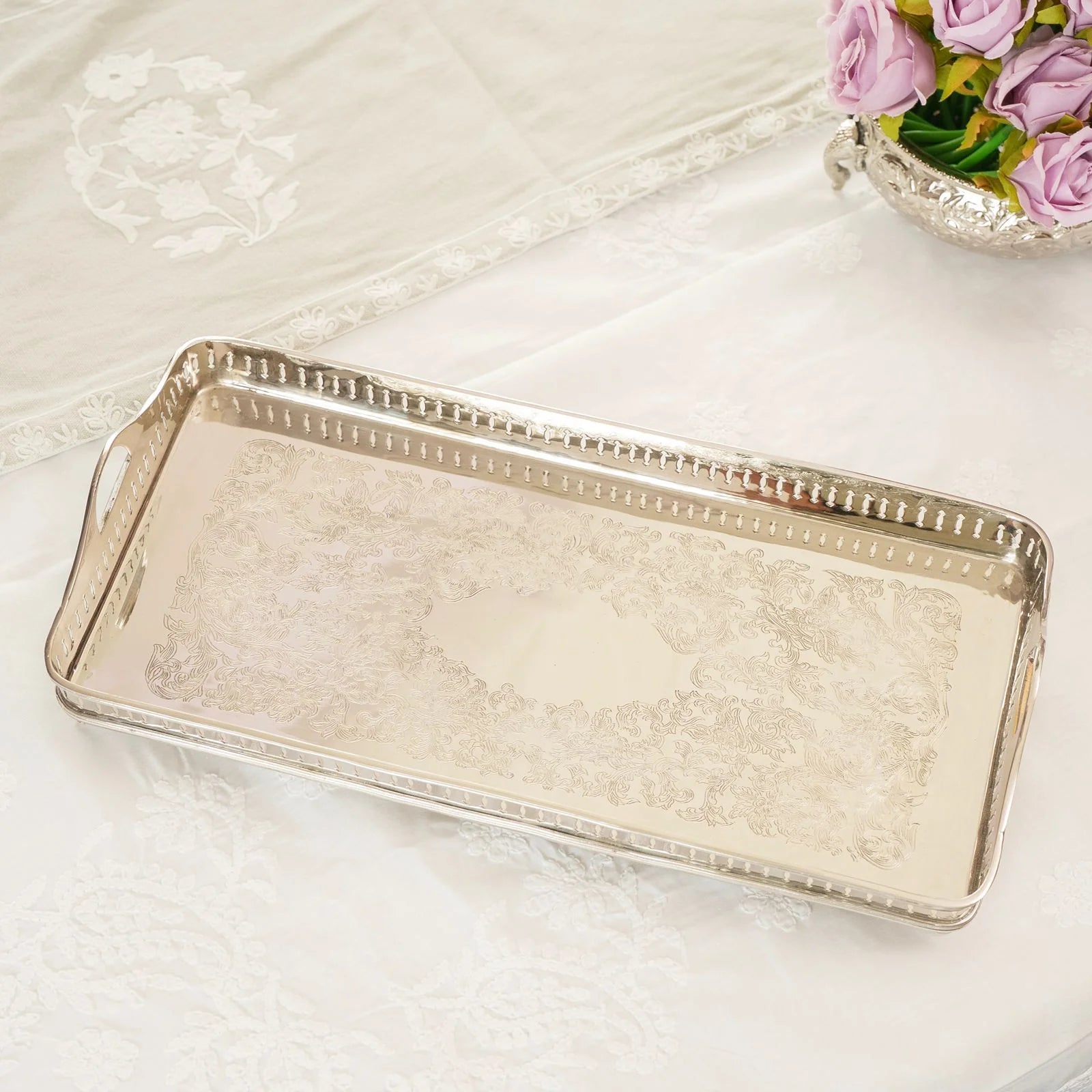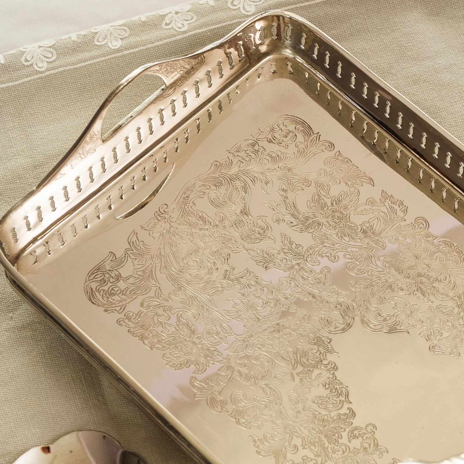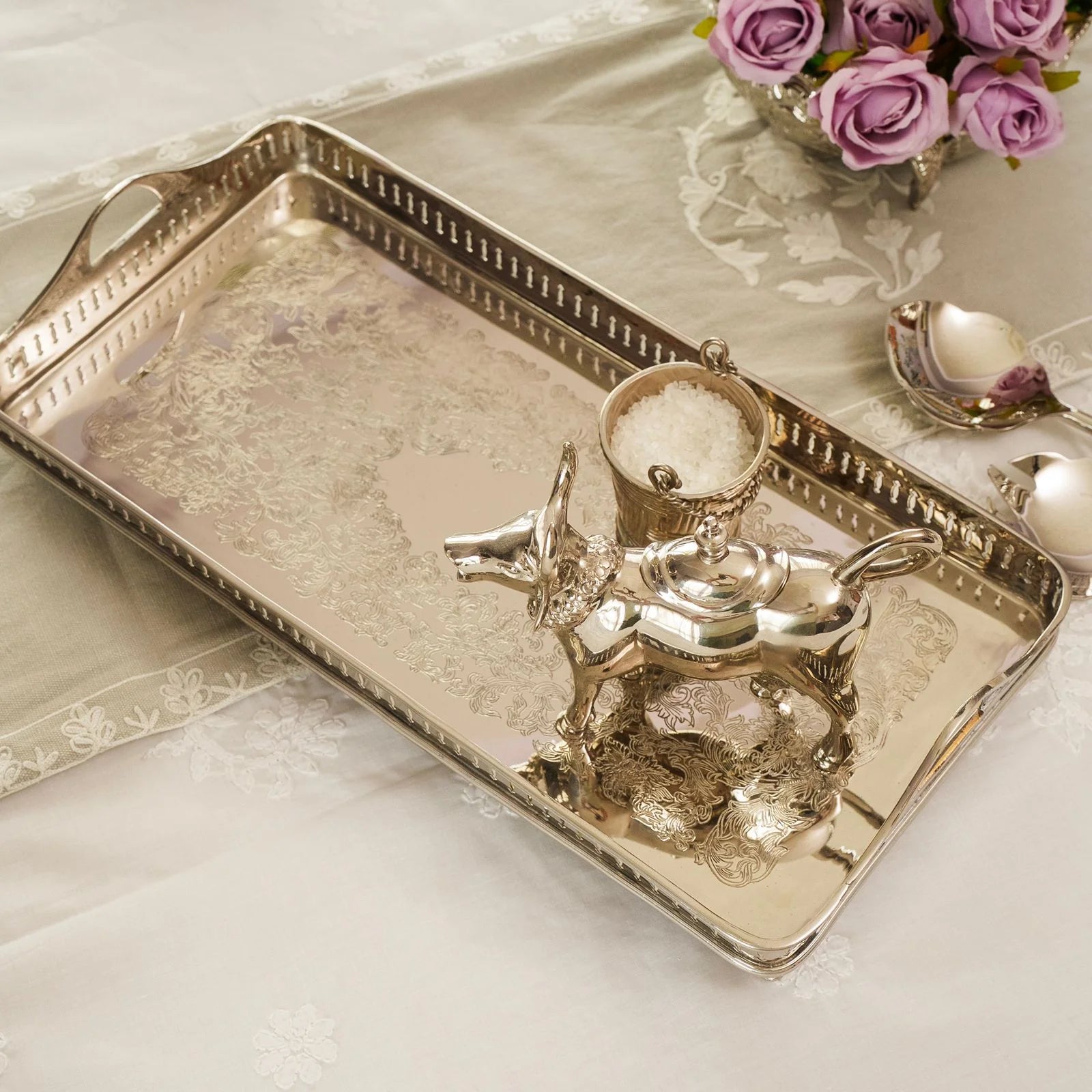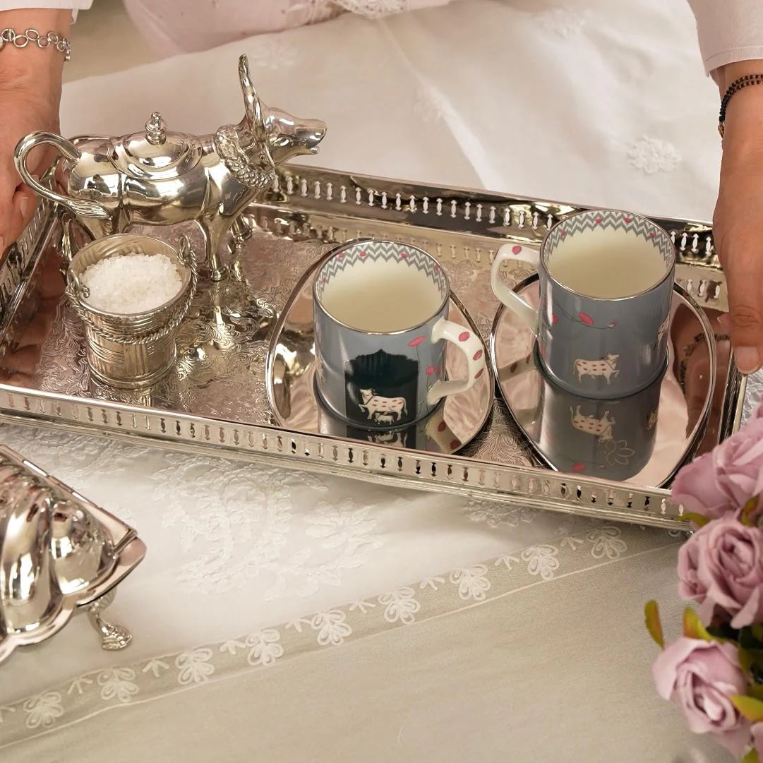 The ornate border and refined silhouette lend it a regal presence, while the polished brass finish catches and reflects light with quiet sophistication. Whether presenting high tea, serving fine spirits, or gracing a console as décor, Nazm Baaghbrings heritage charm and timeless grandeur to every setting.