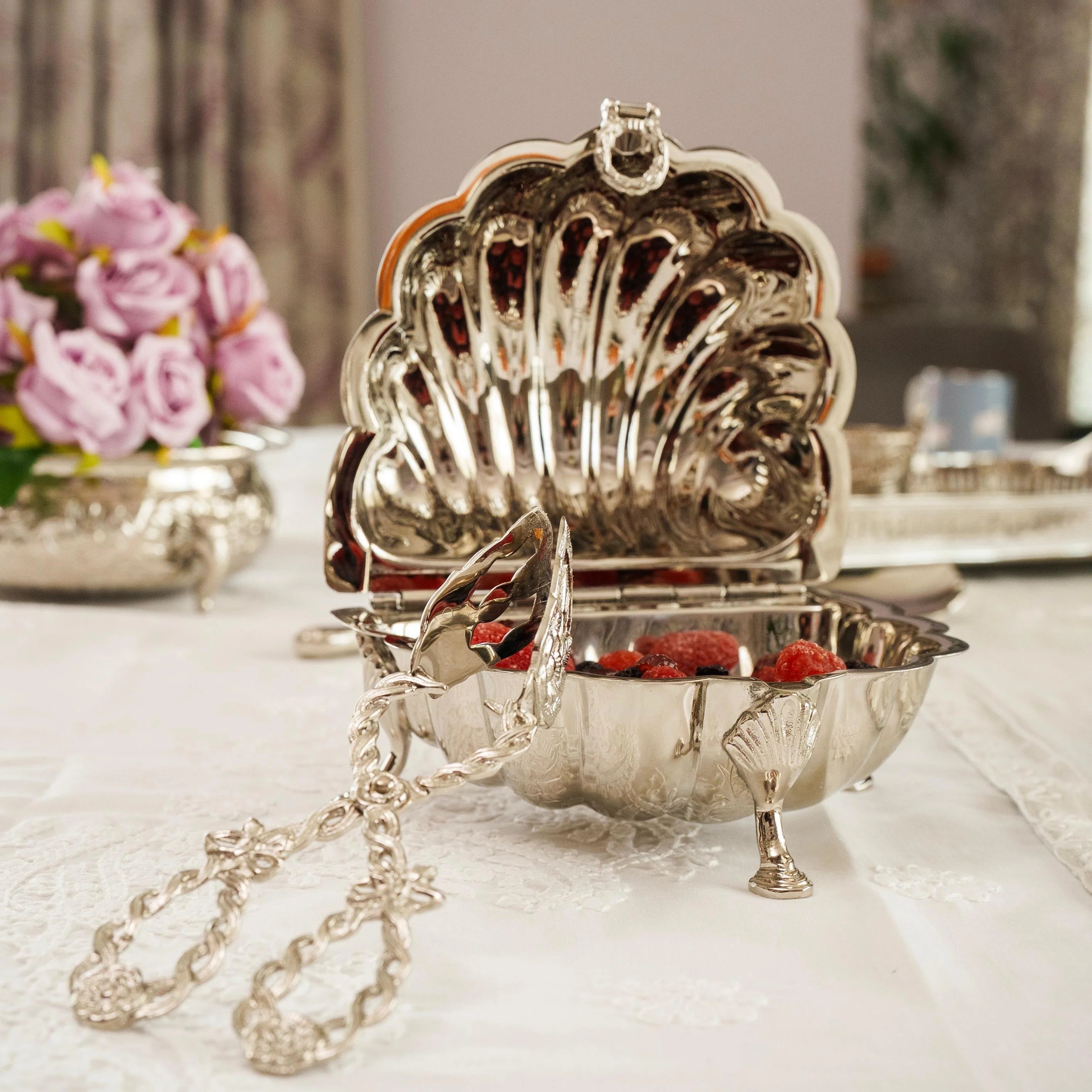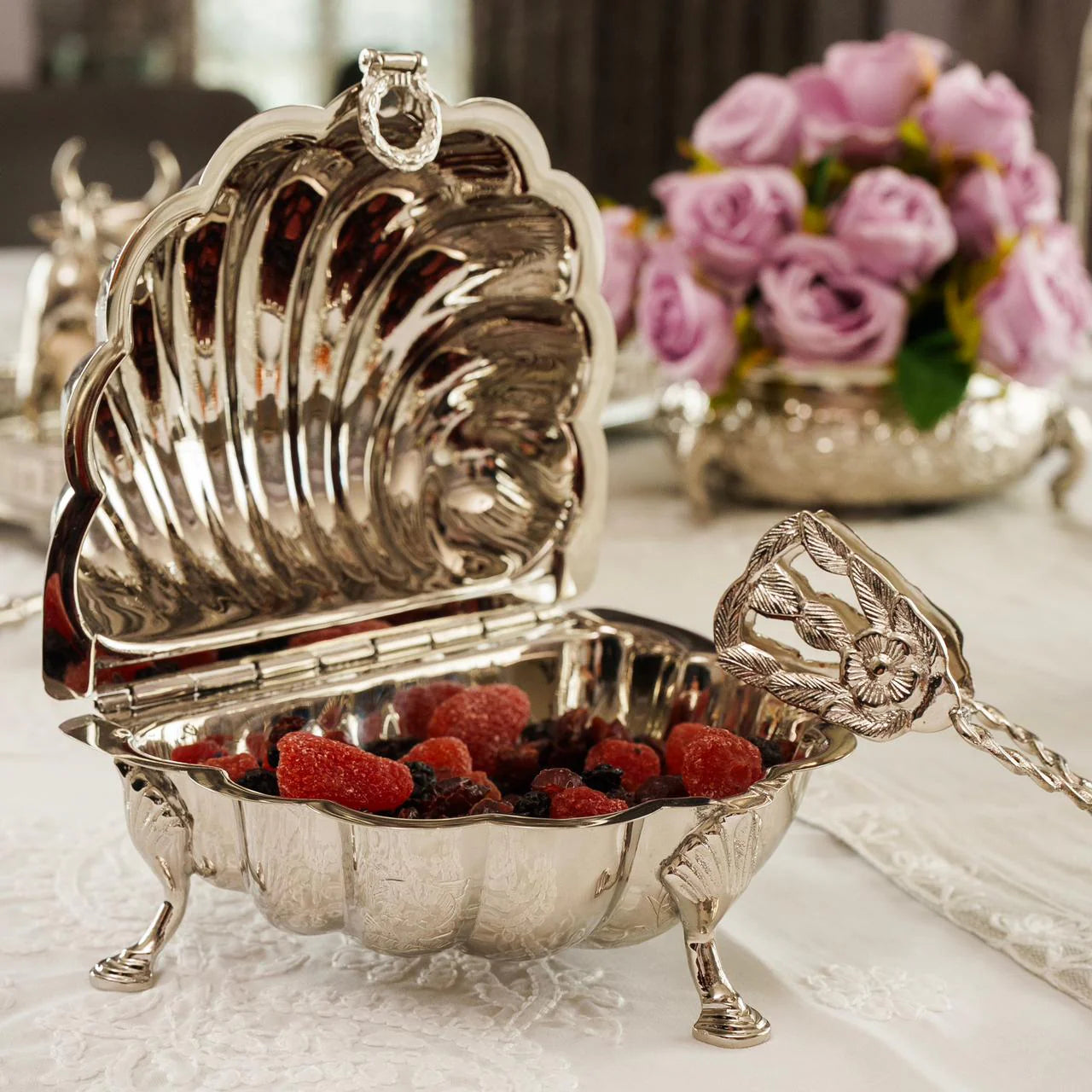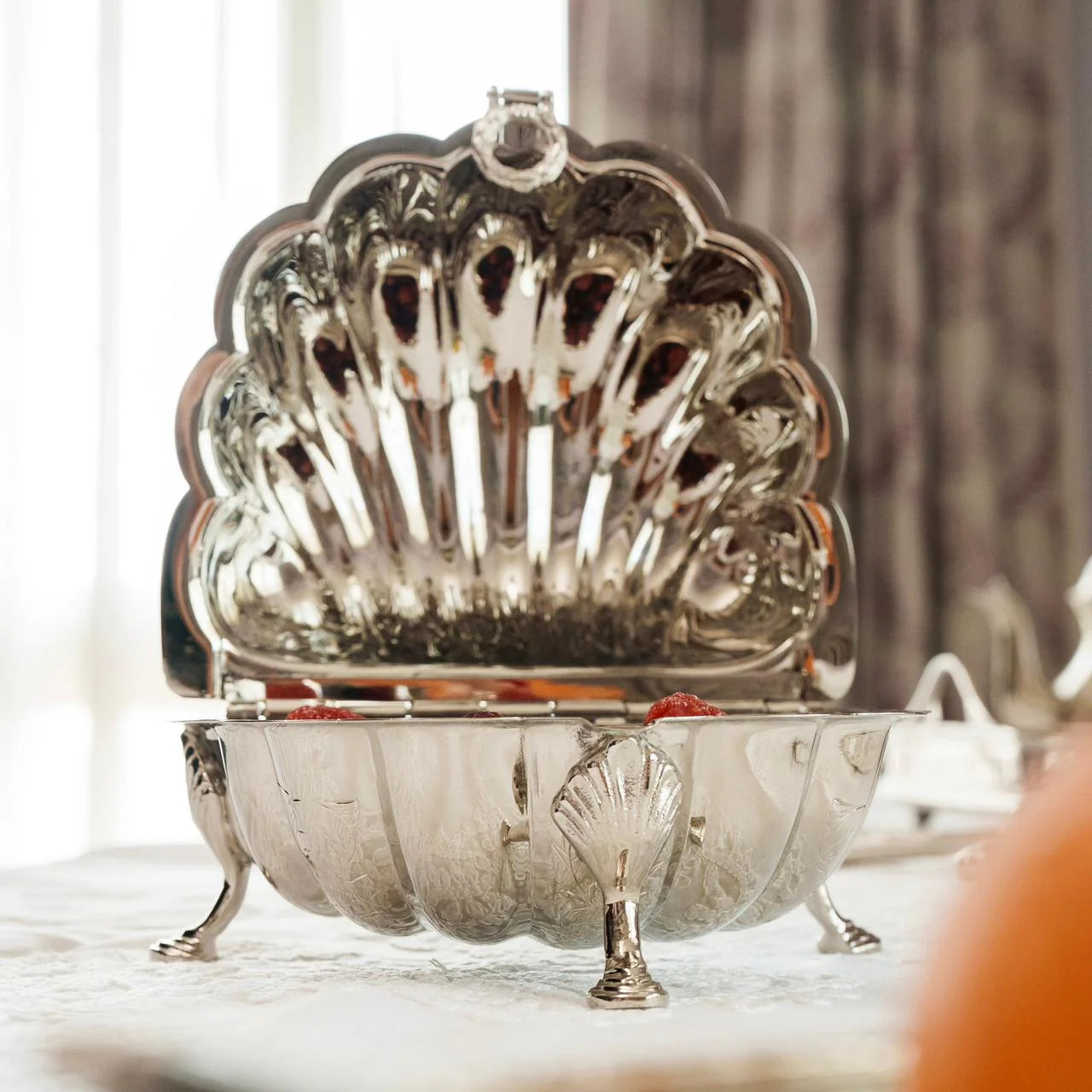 Shaped like a resplendent shell, Noor Daani unfolds with intricate detailing that glimmers at every glance. Resting gracefully on three handcrafted legs, it is as much a sculpture as it is a vessel of purpose — a creation where form and function waltz in perfect harmony.