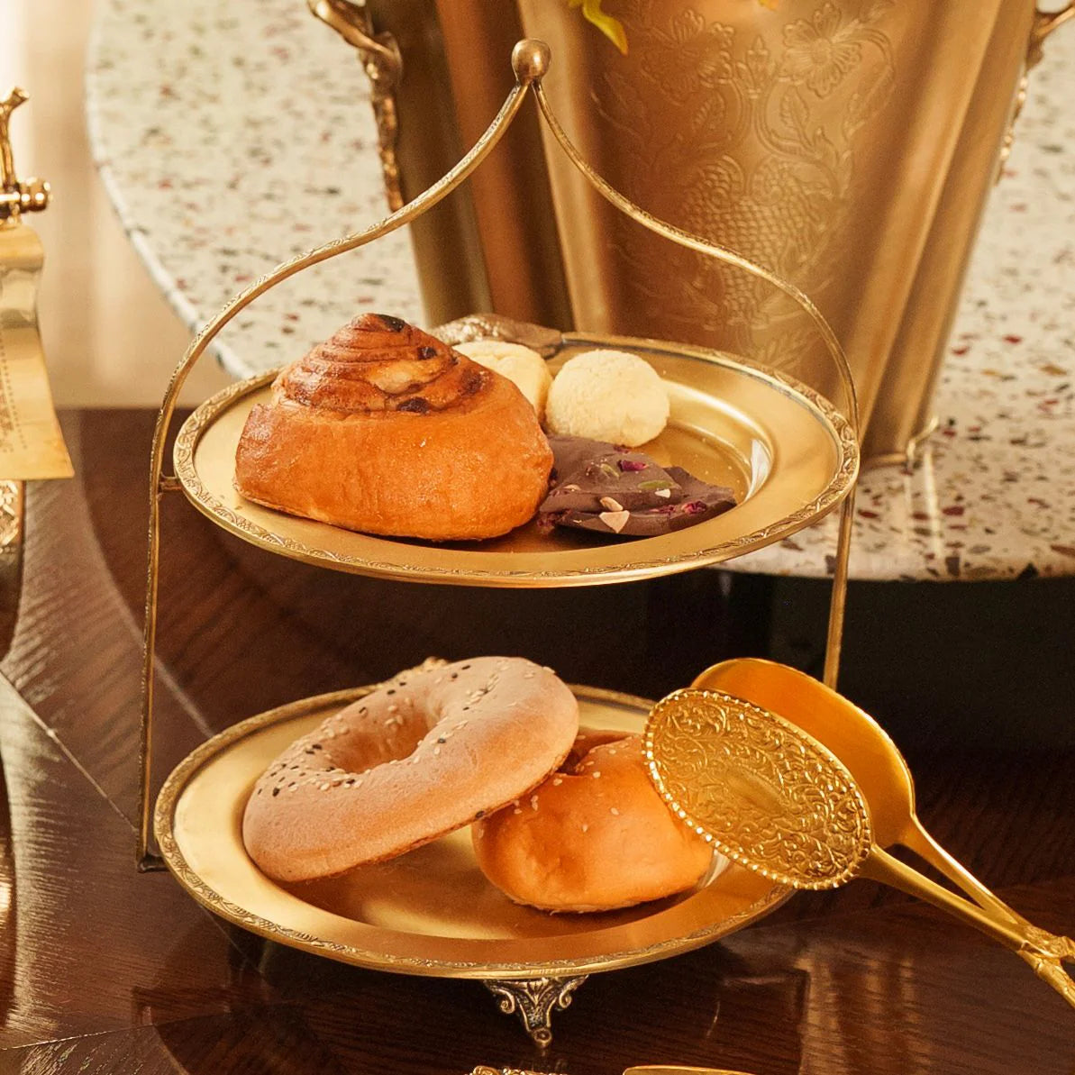 Grace your table with Shahgul, a handcrafted two-tier platter in radiant brass. With its lustrous gleam and finely detailed edges, Shahgul evokes royal sophistication while serving modern gatherings with effortless style.
